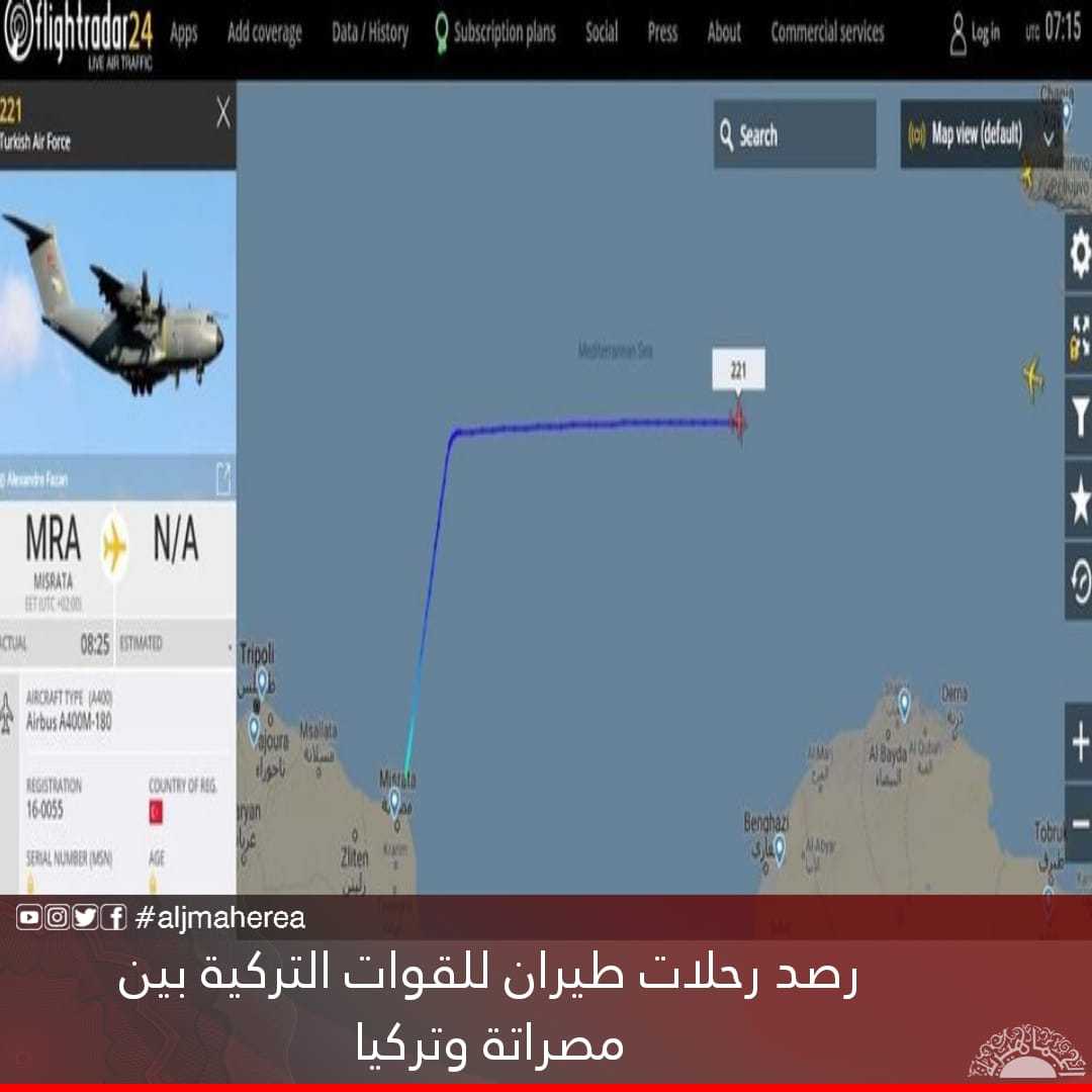رصدت حركة الطيران المتخصصة في تسجيل حركة الطيران عبر دول العالم قيام طائرة نوع ايرباص من طراز A400 -221 تابعة للقوات الجوية التركية برحلة بين مصراتة وتركيا .