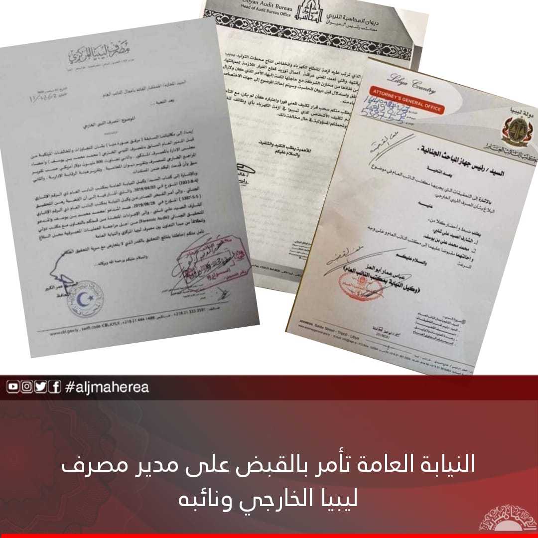 امرت النيابة العامة بالقبض على (محمد بن يوسف) مدير مصرف ليبيا الخارجي ونائبه الشارف شلبي صهر السراج .