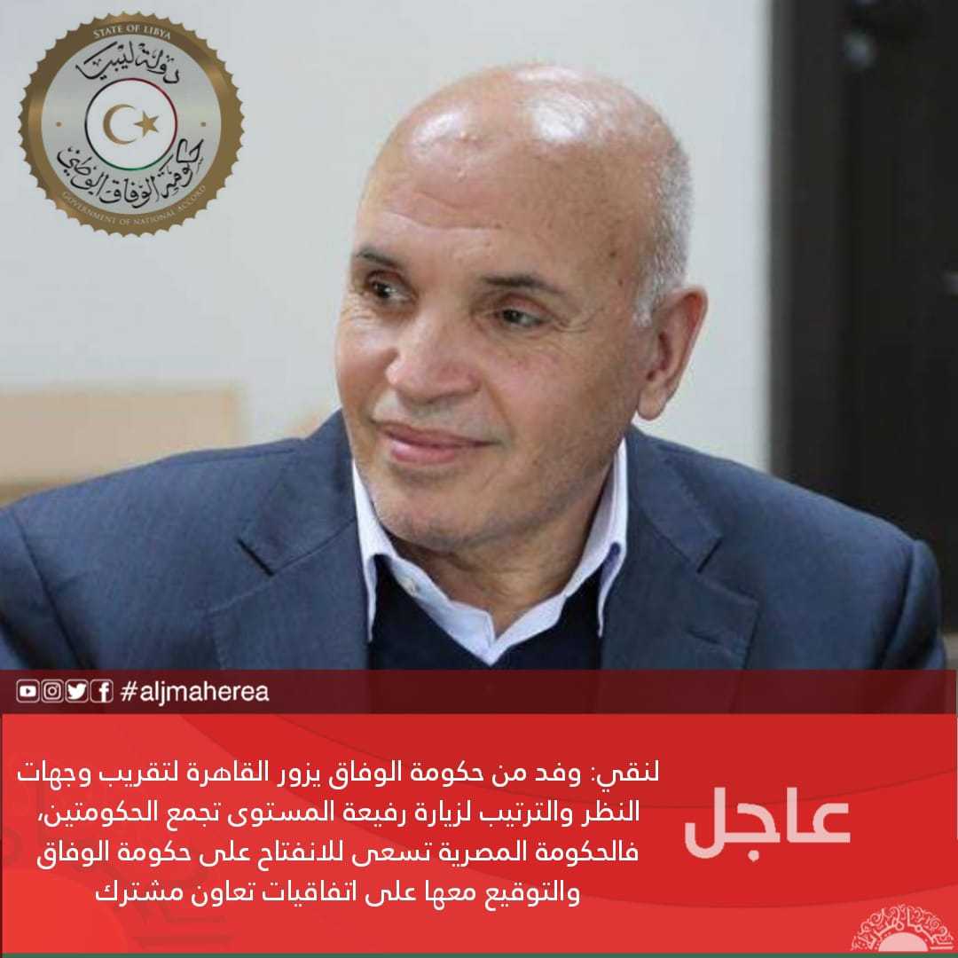 لنقي: وفد من حكومة الوفاق يزور القاهرة لتقريب وجهات النظر والترتيب لزيارة رفيعة المستوى تجمع الحكومتين، فالحكومة المصرية تسعى للانفتاح على حكومة الوفاق والتوقيع معها على اتفاقيات تعاون مشترك