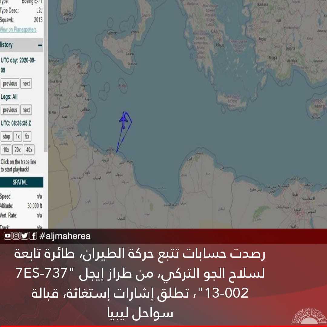 رصدت حسابات تتبع حركة الطيران، طائرة تابعة لسلاح الجو التركي، من طراز إيجل “737-7ES 13-002″، تطلق إشارات إستغاثة، قبالة سواحل ليبيا