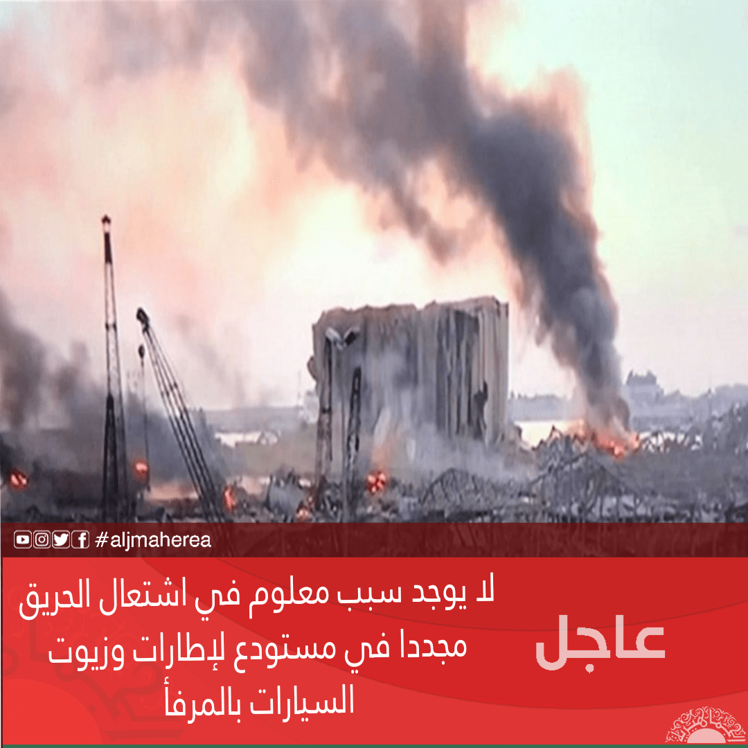 عاجل // لا يوجد سبب معلوم في اشتعال الحريق مجددا في مستودع لإطارات وزيوت السيارات بالمرفأ