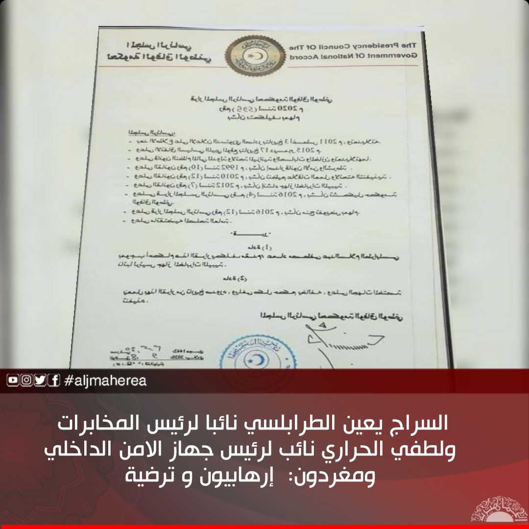 السراج يعين الطرابلسي نائبا لرئيس المخابرات ولطفي الحراري نائب لرئيس جهاز الامن الداخلي ومغردون: إرهابيون و ترضية