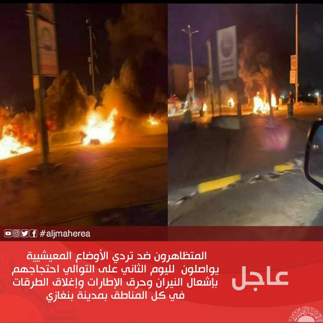 عاجل // المتظاهرون ضد تردي الأوضاع المعيشيية يواصلون لليوم الثاني على التوالي احتجاجهم بإشعال النيران وحرق الإطارات وإغلاق الطرقات في كل المناطق بمدينة بنغازي