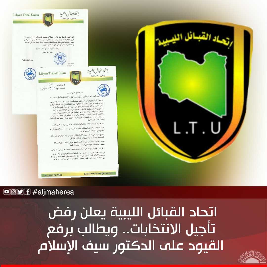 أعلن اتحاد القبائل الليبية، مساء اليوم الجمعة، رفضه تأجيل الانتخابات الرئاسية والبرلمانية، مُطالبًا بعقدها في موعدها الربيع/مارس القادم، ورفع القيود على الدكتور سيف الإسلام القذافي ليمارس الحياة السياسة، باعتباره قائد المصالحة الوطنية وأمل الليبيين في الاستقرار والرُقي.
