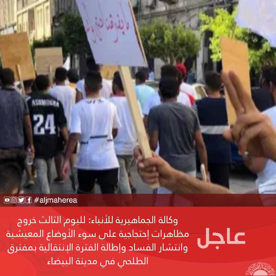 وكالة الجماهيرية للأنباء: لليوم الثالث خروج مظاهرات إحتجاجية على سوء الأوضاع المعيشية وانتشار الفساد وإطالة الفترة الإنتقالية بمفترق الطلحي في مدينة البيضاء.