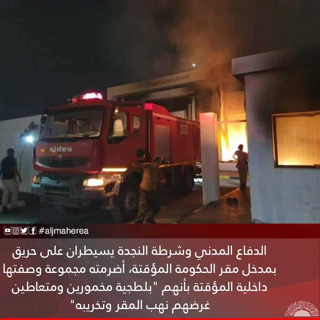 أوج بنغازي / الدفاع المدني وشرطة النجدة يسيطران على حريق بمدخل مقر الحكومة المؤقتة، أضرمته مجموعة وصفتها داخلية المؤقتة بأنهم “بلطجية مخمورين ومتعاطين غرضهم نهب المقر وتخريبه”