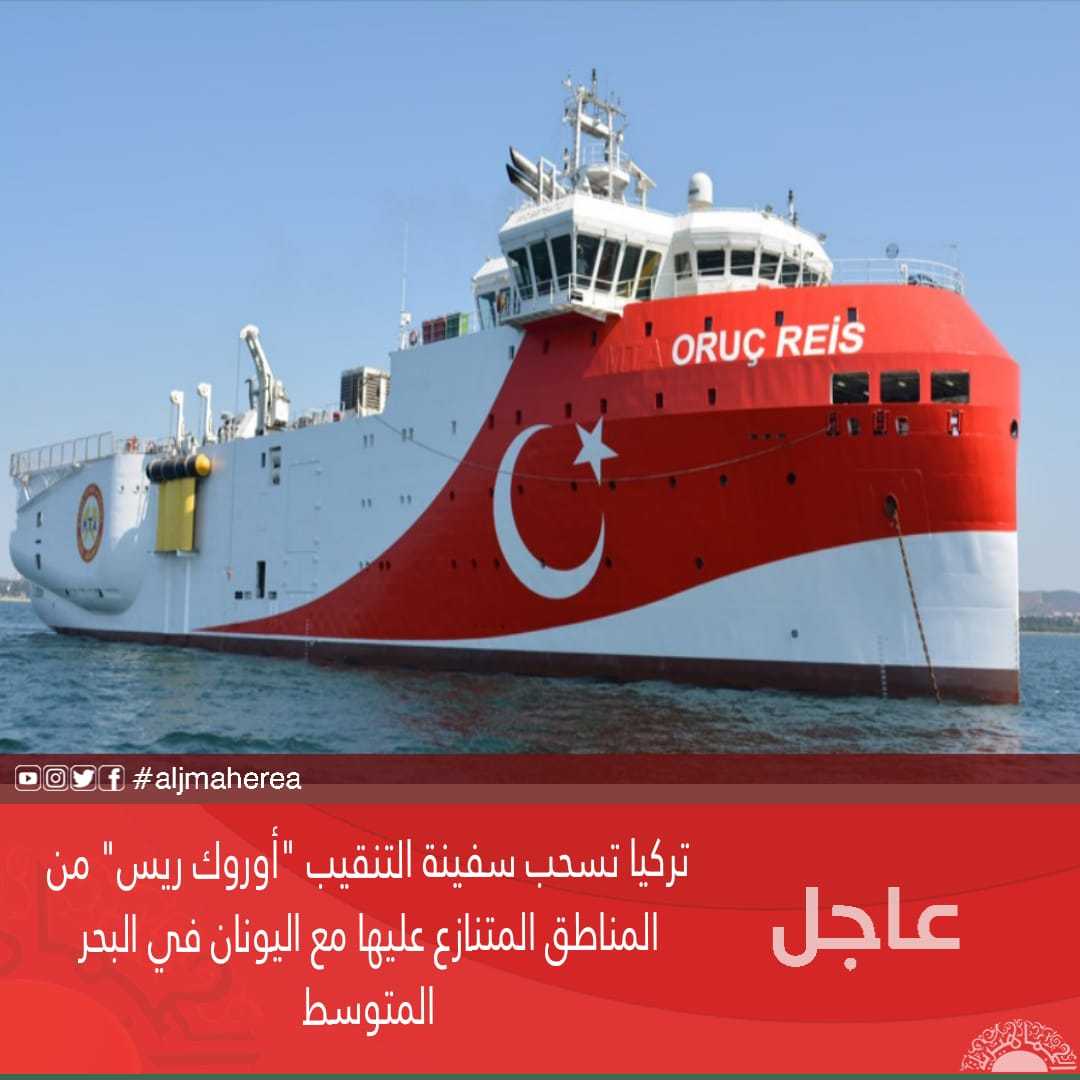 عاجل // ‏تركيا تسحب سفينة التنقيب “أوروك ريس” من المناطق المتنازع عليها مع اليونان في البحر المتوسط