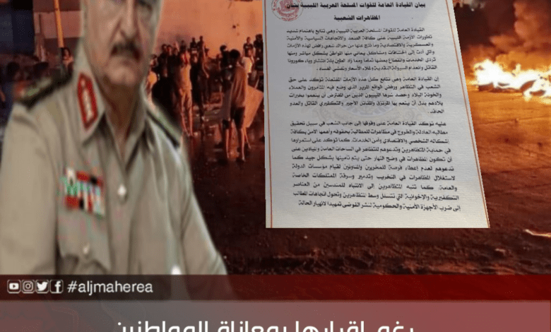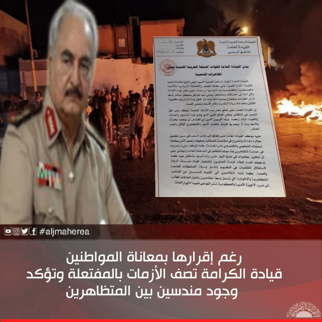 وأشار البيان إلى متابعة القيادة “باهتمام شديد تطورات الأزمة الليبية على كافة الأصعدة والاتجاهات السياسية والأمنية والعسكرية والاقتصادية وما نتج عنها من حراك شعبي رافض لهذه الأزمات التي أدت إلى اختناقات ومشاكل يعاني منها المواطن بشكل مباشر، ومنها تردي الخدمات وانقطاع بعضها تمامًا”، موضحًا أن ما زاد الطين بلة هو انتشار وباء كورونا القاتل وانعدام السيولة النقدية وغلاء الأسعار وتفشي الفساد.
