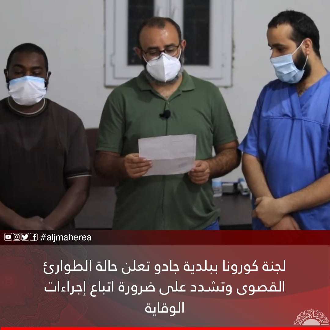 أعلنت اللجنة العليا لإدارة أزمة كورونا ببلدية جادو، حالة الطوارئ القصوى دون استثناء، وذلك نظرًا لتزايد عدد الحالات المصابة، في البلدية، مُحذرة من التجمعات في المناسبات الاجتماعية، ومشددة على ضرورة ارتداء الكمامات.