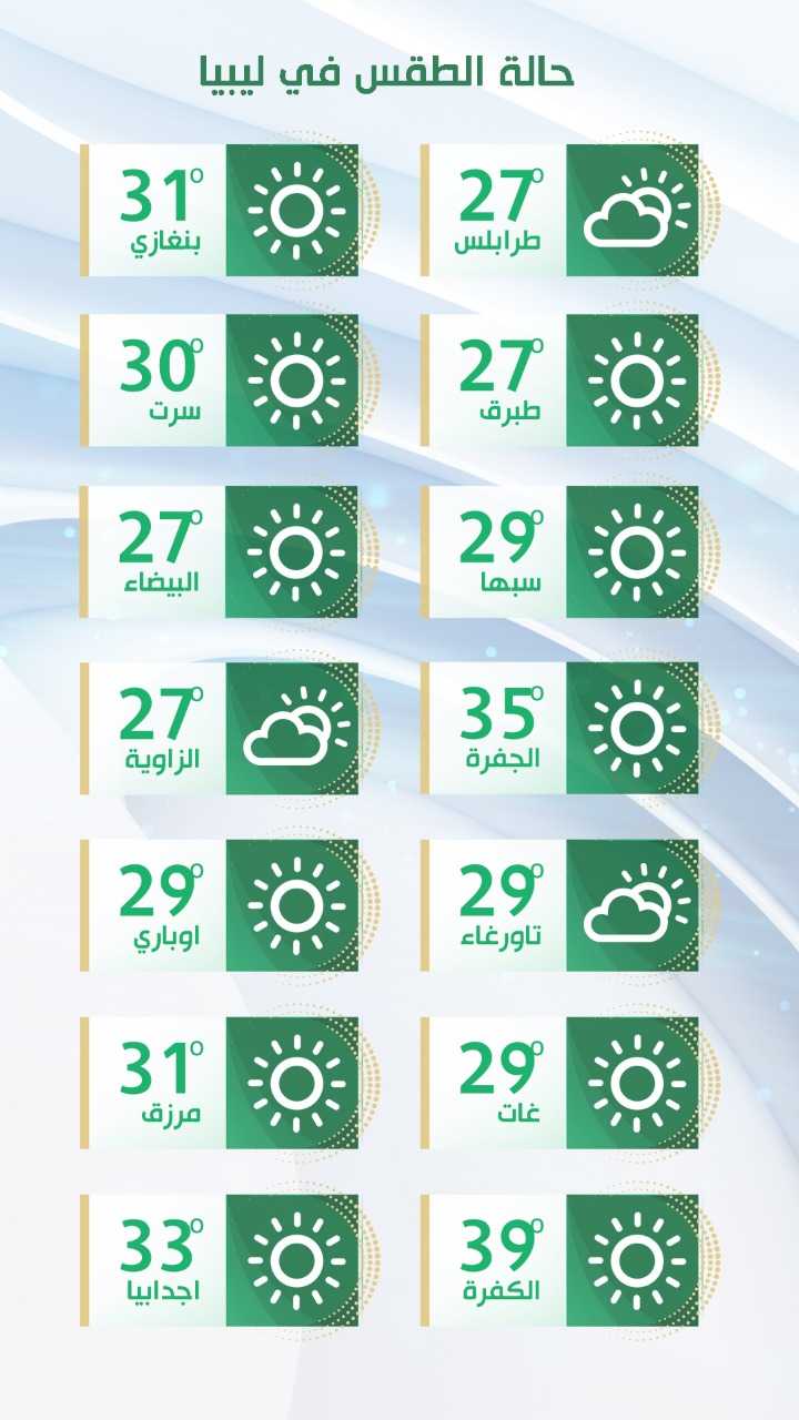 ** بمناطق الوسط والجنوب طقس مستقر مع حرارة دون تغير ونتوقع نشاط نسبي للرياح بمناطق الجفرة.