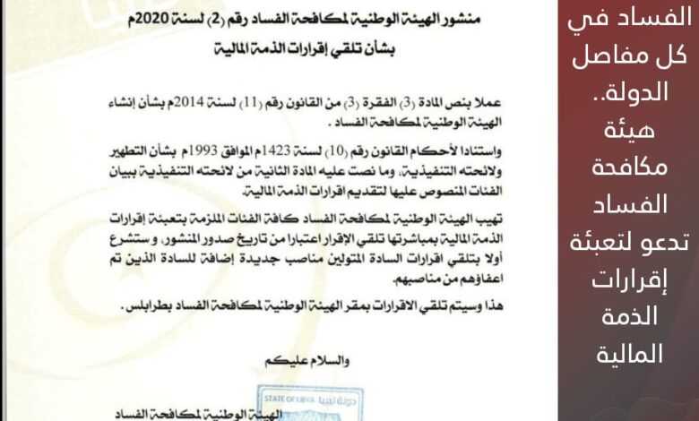 بعد تفشي الفساد في كل مفاصل الدولة.. هيئة مكافحة الفساد تدعو لتعبئة إقرارات الذمة المالية