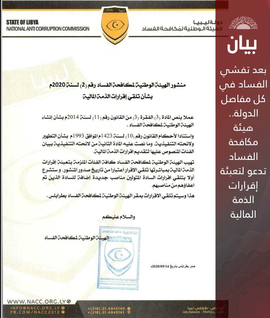 دعت الهيئة الوطنية لمكافحة الفساد كافة الفئات الملزمة، بضرورة تعبئة إقرارات الذمة المالية ومباشرتها وتلقي الإقرار اعتبارا من تاريخ الرابع عشر من سبتمبر الجاري.