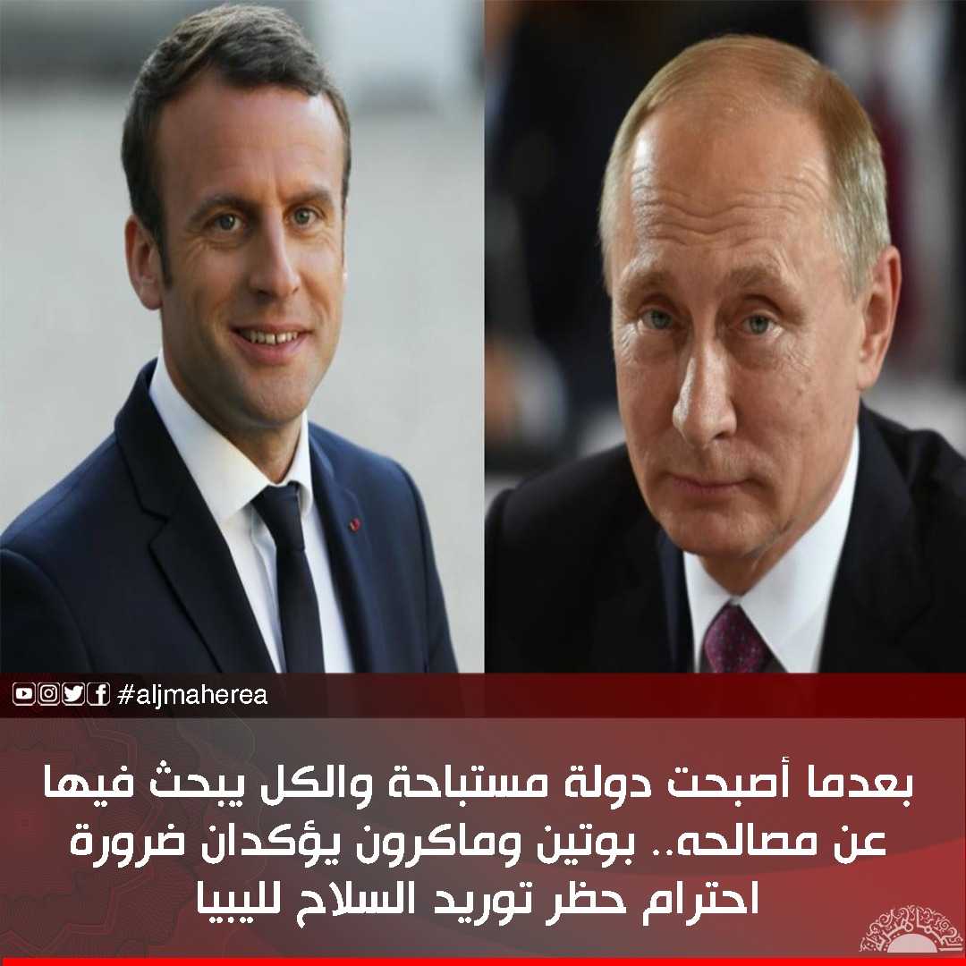 أكد الرئيسان الروسي والفرنسي فلاديمير بوتين وإيمانويل ماكرون على ضرورة احترام الجميع لحظر توريد السلاح المفروض على ليبيا وتشجيع الحل السياسي.