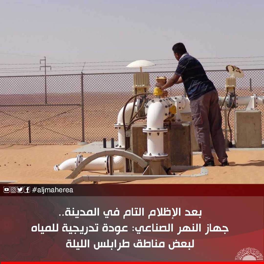 أكد جهاز النهر الصناعي منظومة الحساونة سهل الجفارة، عودة المياه التدريجي لبعض مناطق مدينة طرابلس هذه الليلة وزيادة معدلات التدفق يوم الغد مساءً الثلاثاء