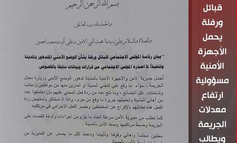 اجتماعي قبائل ورفلة يحمل الأجهزة الأمنية مسؤولية ارتفاع معدلات الجريمة ويطالب بالإفراج عن المختطفين