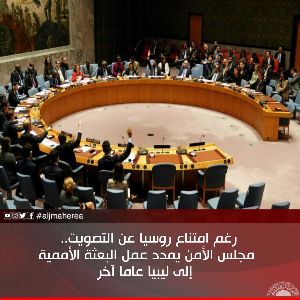 وافق مجلس الأمن الدولي، اليوم الثلاثاء، على تمديد عمل بعثة الأمم المتحدة إلى ليبيا عاما آخر، وسط امتناع روسيا عن التصويت .