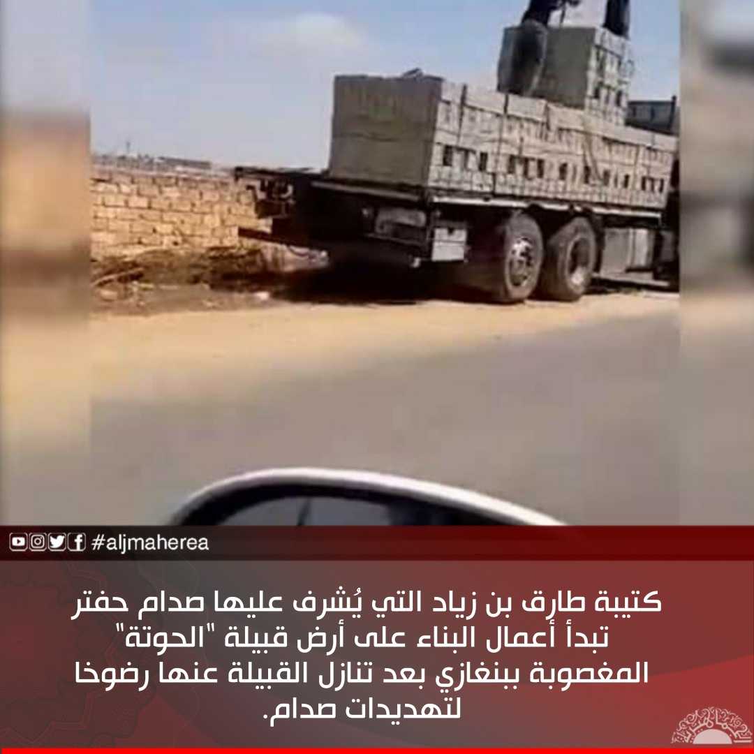 كتيبة طارق بن زياد التي يُُشرف عليها صدام حفتر تبدأ أعمال البناء على أرض قبيلة “الحوتة” المغصوبة ببنغازي بعد تنازل القبيلة عنها رضوخا لتهديدات صدام.