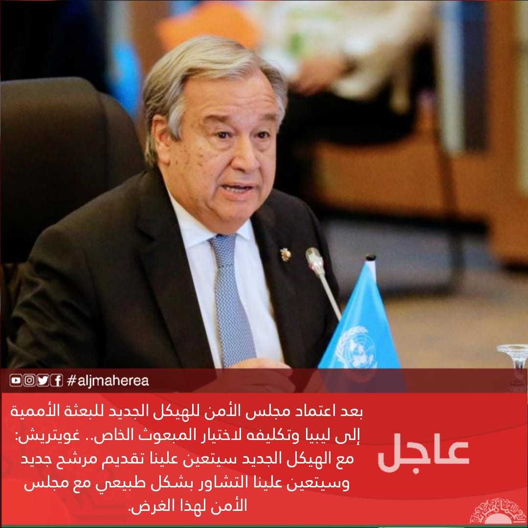 عاجل // بعد اعتماد مجلس الأمن للهيكل الجديد للبعثة الأممية إلى ليبيا وتكليفه لاختيار المبعوث الخاص.. غويتريش: مع الهيكل الجديد سيتعين علينا تقديم مرشح جديد وسيتعين علينا التشاور بشكل طبيعي مع مجلس الأمن لهذا الغرض