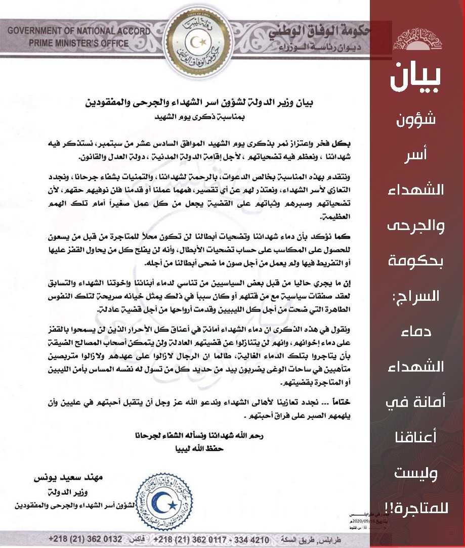 شؤون أسر الشهداء والجرحى بحكومة السراج: دماء الشهداء أمانة في أعناقنا وليست للمتاجرة!!