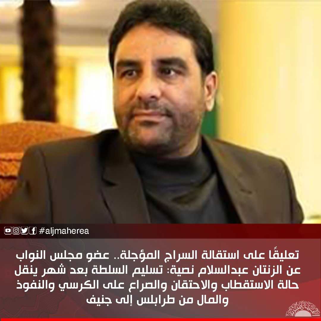 تعليقًا على استقالة السراج المؤجلة.. عضو مجلس النواب عن الزنتان عبدالسلام نصية: تسليم السلطة بعد شهر ينقل حالة الاستقطاب والاحتقان والصراع على الكرسي والنفوذ والمال من طرابلس إلى جنيف