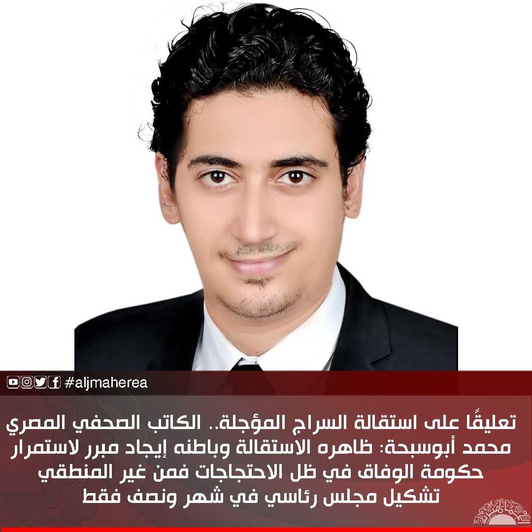 تعليقًا على استقالة السراج المؤجلة.. الكاتب الصحفي المصري محمد أبوسبحة: ظاهره الاستقالة وباطنه إيجاد مبرر لاستمرار حكومة الوفاق في ظل الاحتجاجات فمن غير المنطقي تشكيل مجلس رئاسي في شهر ونصف فقط