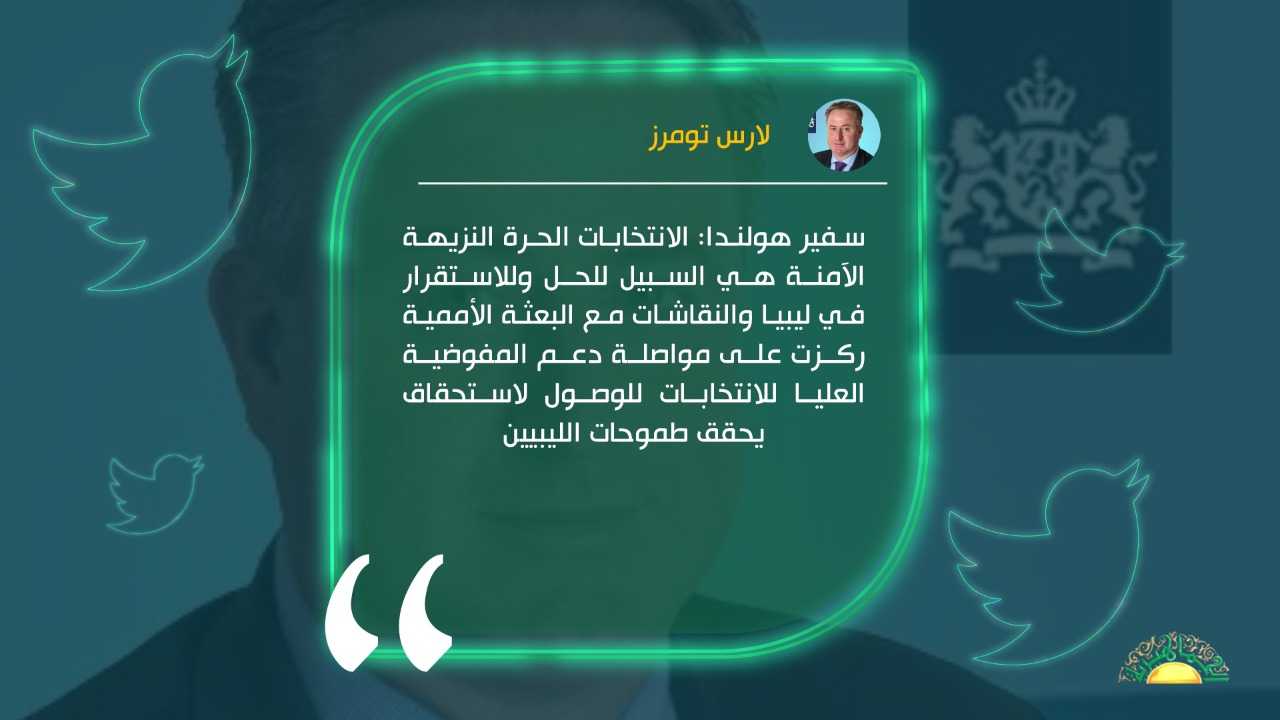 أكد سفير هولندا لدى ليبيا، لارس تومرز، أن إجراء انتخابات حرة ونزيهة وتحظى بالتأمين الكافي هو السبيل للحل والاستقرار في ليبيا