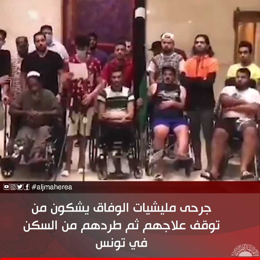 طرد جرحى مليشيات الوفاق، المتواجدين في تونس للعلاج، من وكالة التسكين التي يسكنون فيها لعدم سداد الحكومة الديون المترتبة عليهم.
