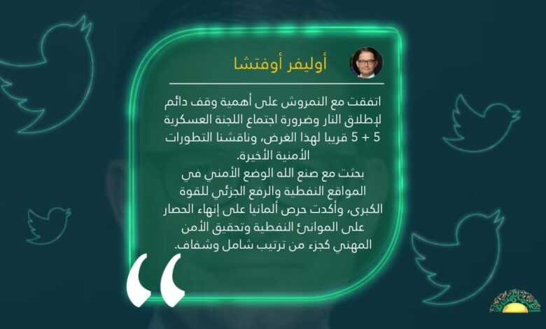 وأكد السفير الألماني دعم بلاده لإنهاء الحصار على الموانئ النفطية وتحقيق الأمن المهني كجزء من ترتيب شامل وشفاف.