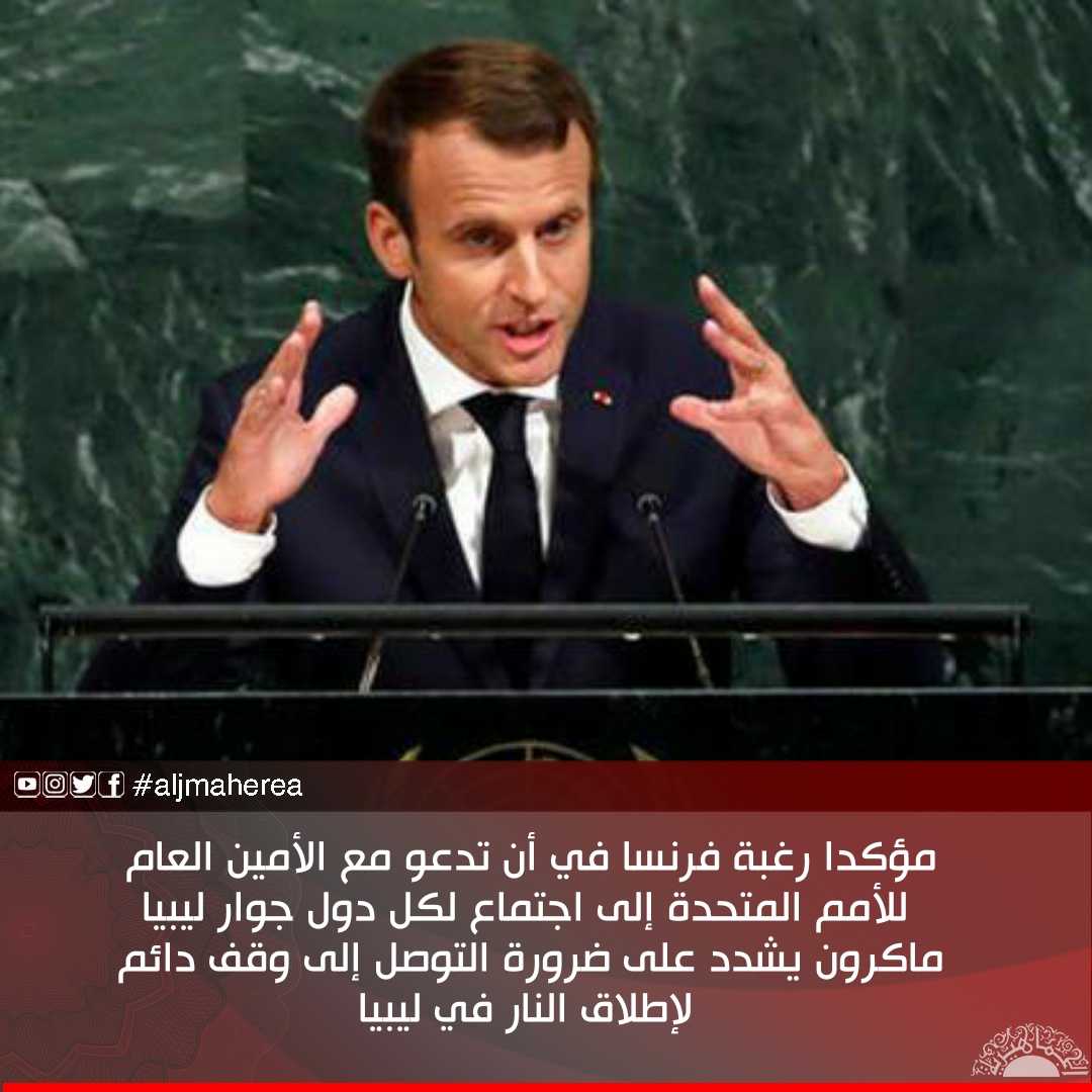 مؤكدا رغبة فرنسا في أن تدعو مع الأمين العام للأمم المتحدة إلى اجتماع لكل دول جوار ليبيا ماكرون يشدد على ضرورة التوصل إلى وقف دائم لإطلاق النار في ليبيا