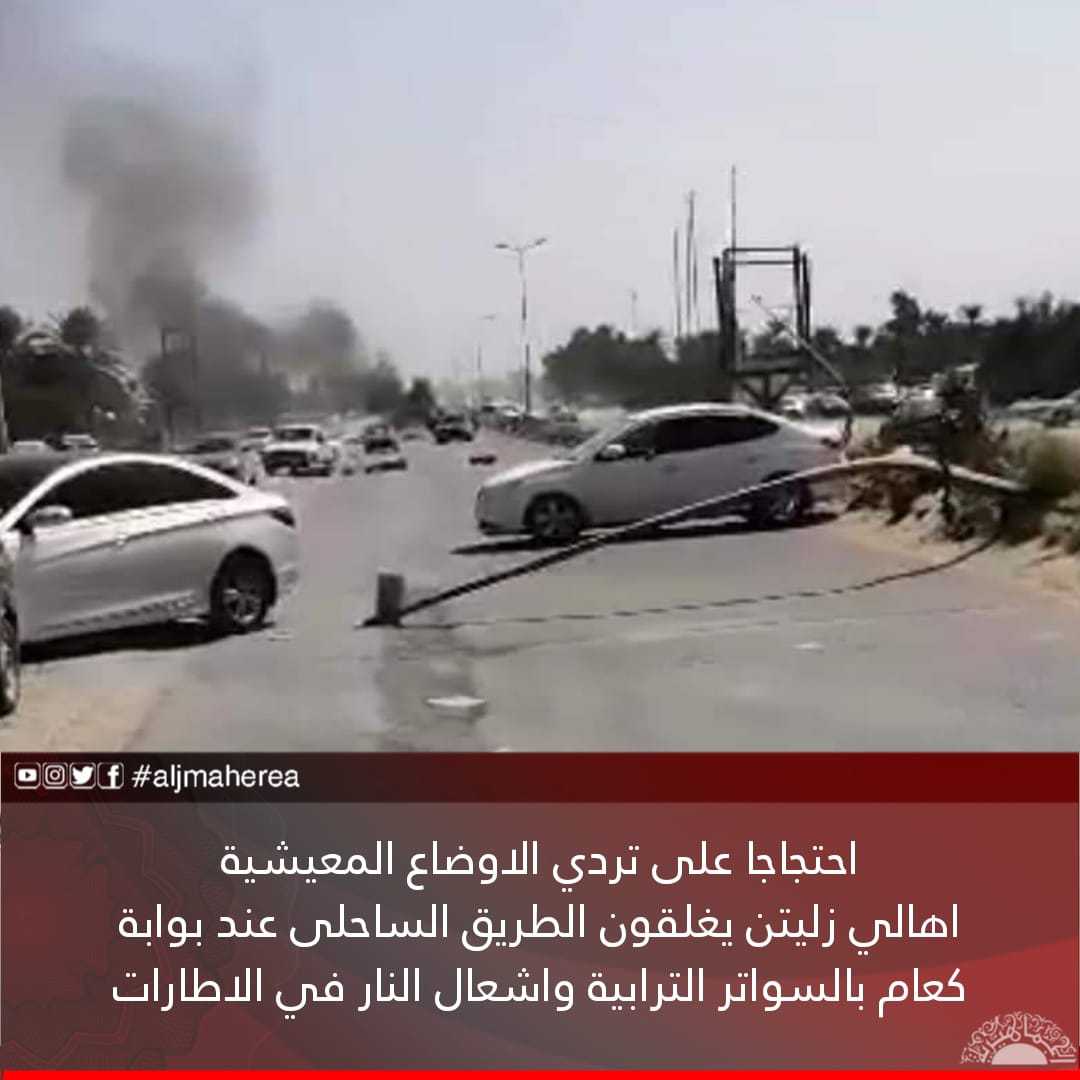 احتجاجا على تردي الاوضاع المعيشية اهالي زليتن يغلقون الطريق الساحلى عند بوابة كعام بالسواتر الترابية واشعال النار في الاطارات