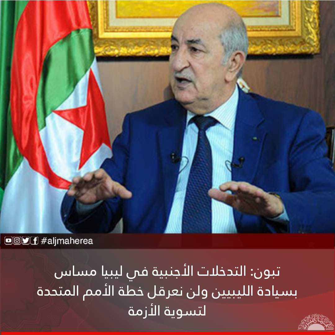 وشدد الرئيس تبون، على أن الجزائر لن تعرقل خطة الأمم المتحدة لتسوية الأزمة في ليبيا، مؤكدًا في الوقت ذاته، أن أي تسوية في البلاد لن تتم دون موافقة الجزائر.