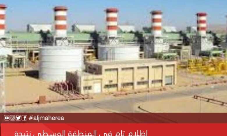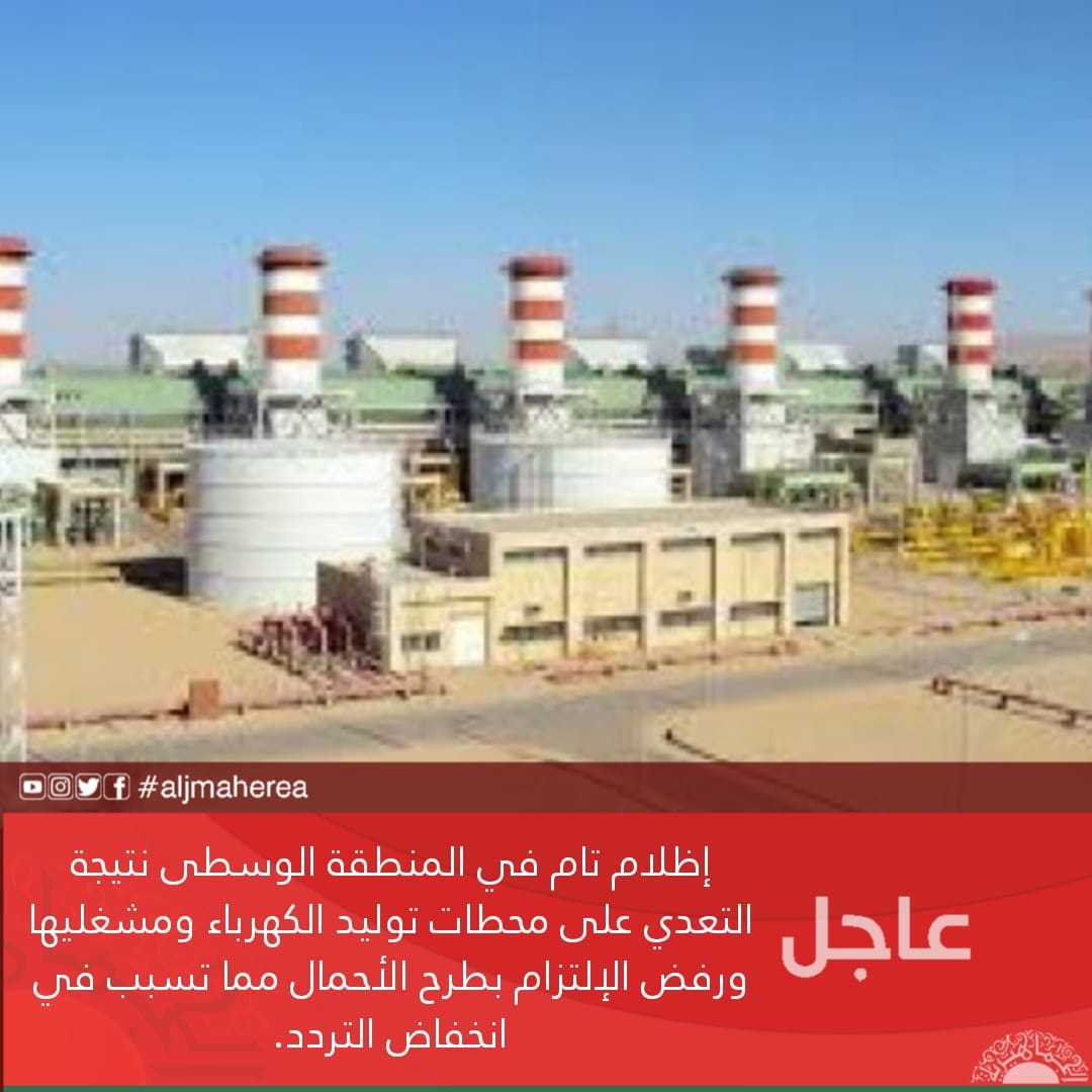 عاجل // إظلام تام في المنطقة الوسطى نتيجة التعدي على محطات توليد الكهرباء ومشغليها ورفض الإلتزام بطرح الأحمال مما تسبب في انخفاض التردد