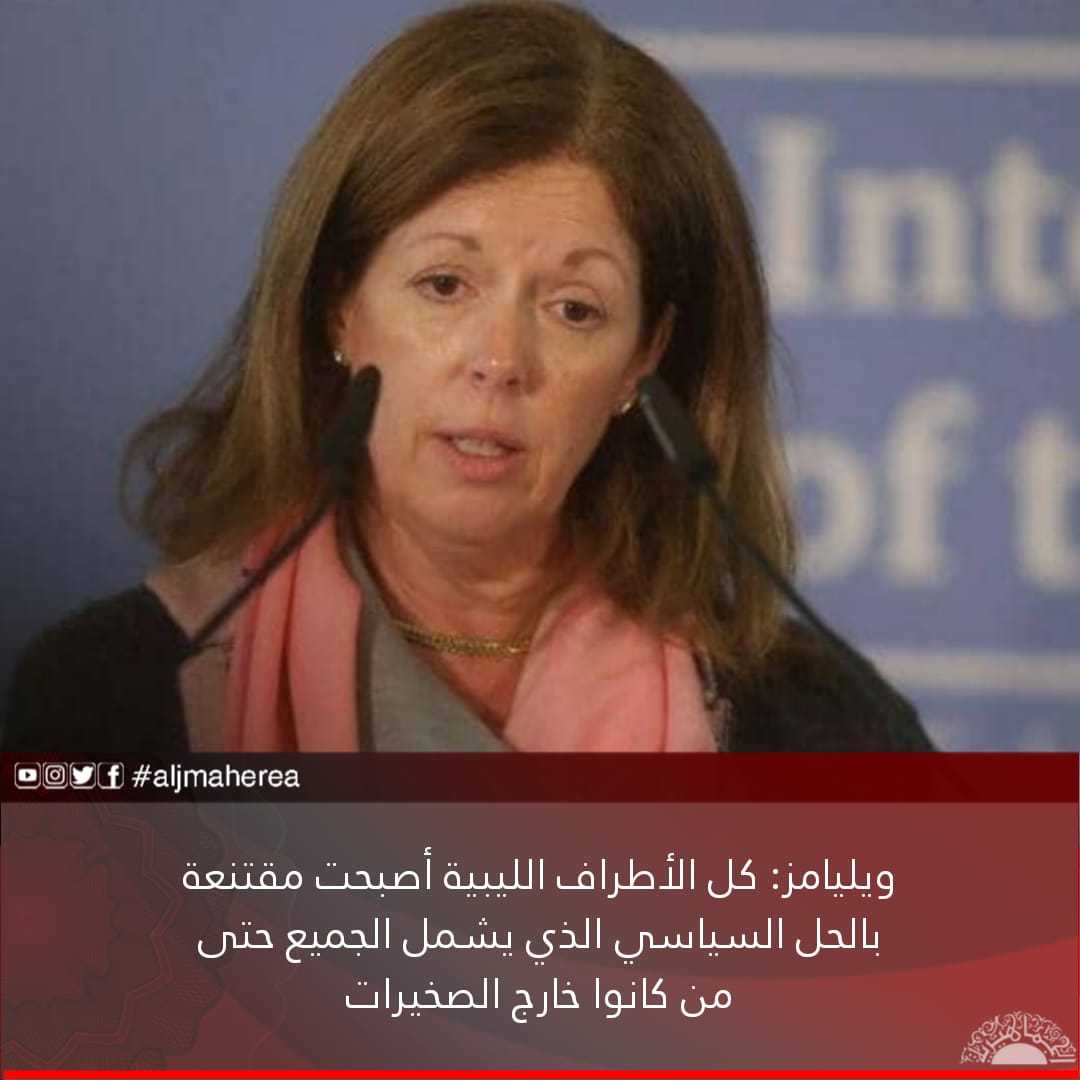وشددت ويليامز، أن أطراف الصراع الليبي باتت لديهم قناعة بأن الحل يجب أن يكون سياسيا وليس عسكريا، ويجب أن يأتي من الليبيين أنفسهم، باعتبارهم المسؤولين عن صياغة المستقبل السياسي لبلادهم من خلال خارطة طريق لحلول توافقية تشمل كل الأطراف بمن فيها من لم يشملهم الاتفاق السياسي، وذلك في إشارة واضحة إلى أنصار النظام الجماهيري.