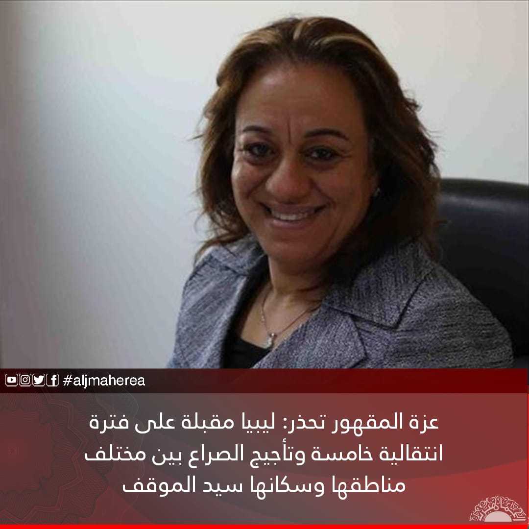 حذرت الكاتبة عزة المقهور، من خطورة وتداعيات المرحلة السياسية القادمة في ليبيا، وقالت حسبما ورد، فإن المرحلة المقبلة ستتبلور من خلال لجنة للحوار تلتئم في الخارج، هي خليط من ممثلين عن مجلسي نواب شرق البلاد وما يسمى بالمجلس الأعلى للدولة، وشخصيات أخرى بدعوة من البعثة الأممية وهناك خطة مرسومة سيتم السير فيها.