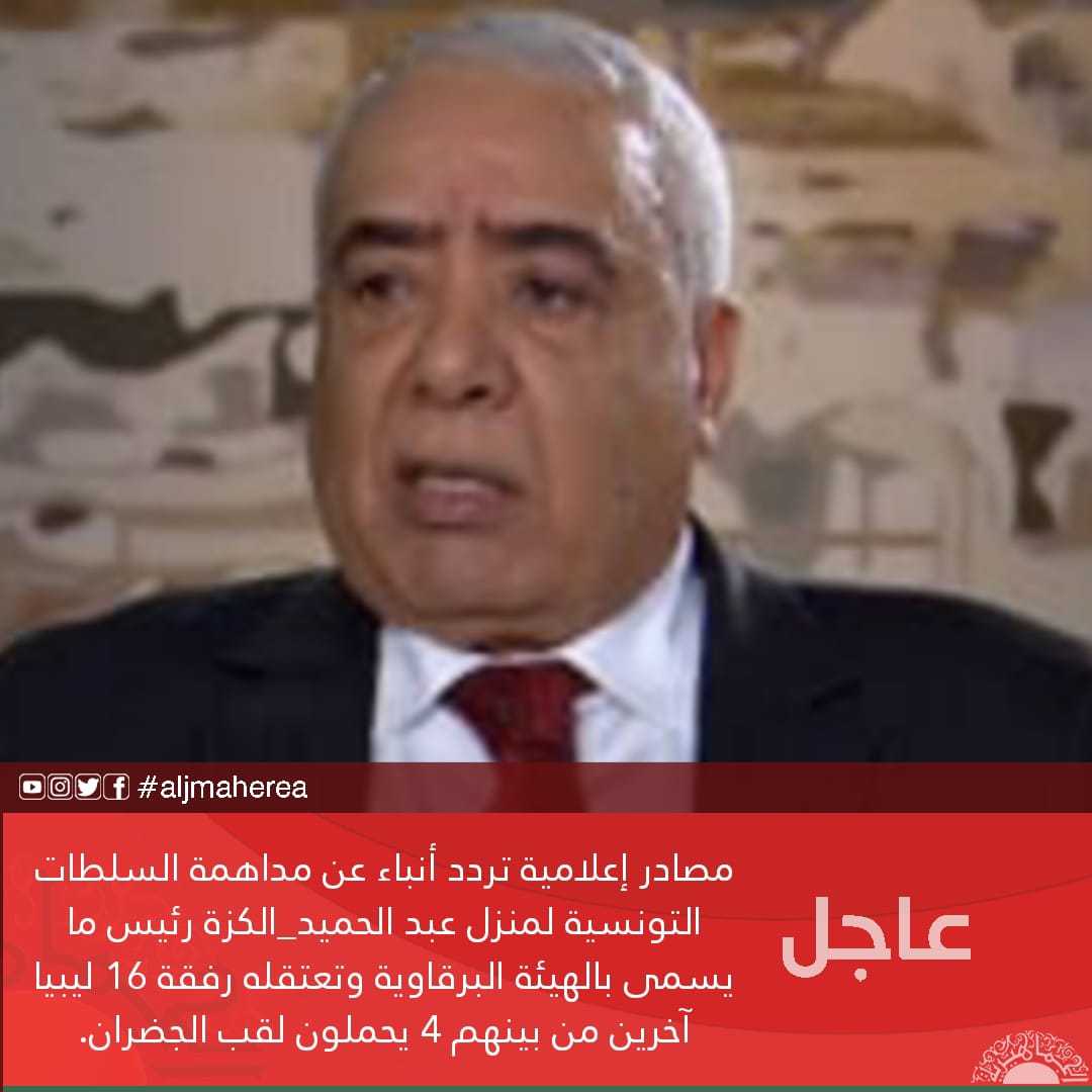 عاجل // مصادر إعلامية تردد أنباء عن مداهمة السلطات التونسية لمنزل عبد الحميد_الكزة رئيس ما يسمى بالهيئة البرقاوية وتعتقله رفقة 16 ليبيا آخرين من بينهم 4 يحملون لقب الجضران