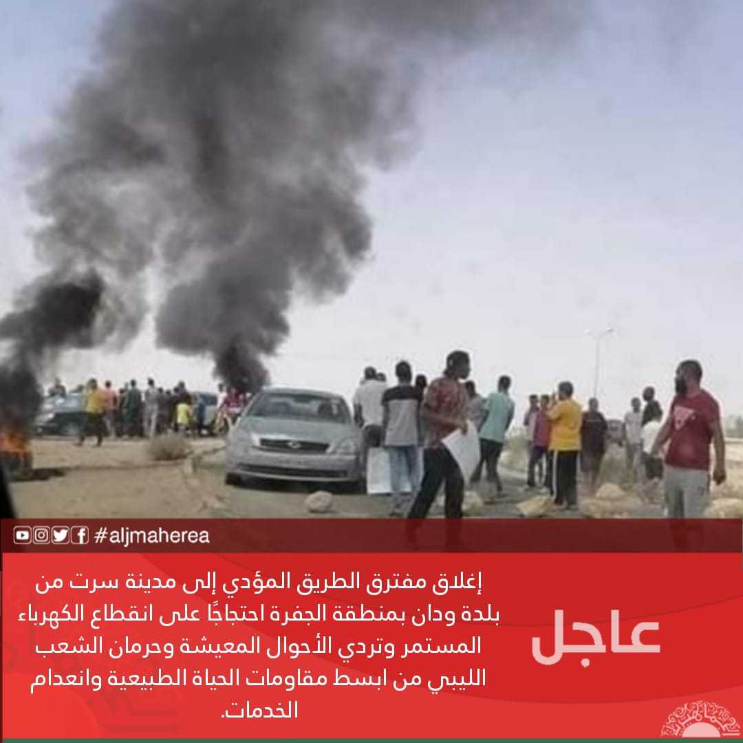 إغلاق مفترق الطريق المؤدي إلى مدينة سرت من بلدة ودان بمنطقة الجفرة احتجاجًا على انقطاع الكهرباء المستمر وتردي الأحوال المعيشة وحرمان الشعب الليبي من ابسط مقاومات الحياة الطبيعية وانعدام الخدمات.