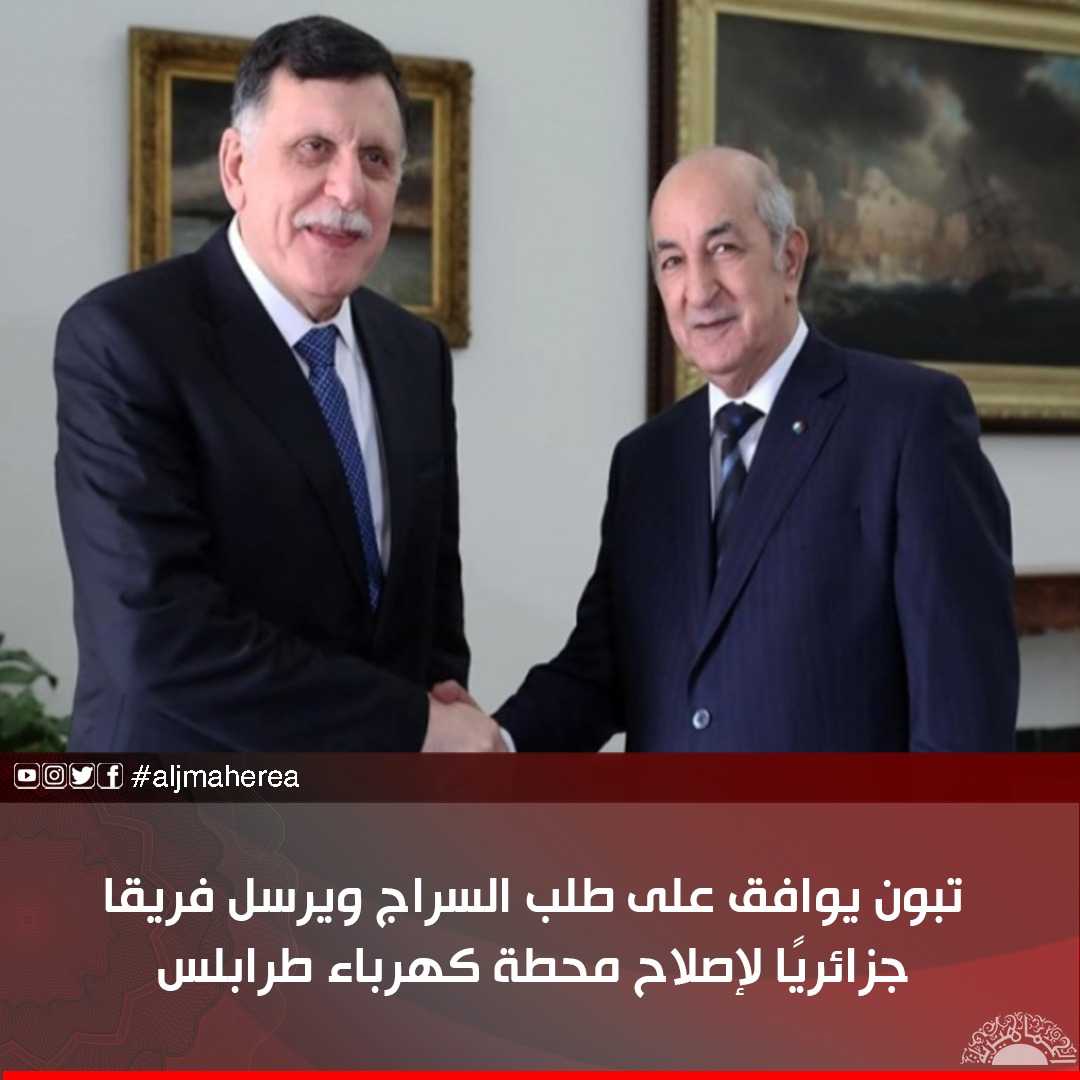 وأكد البيان موافقة الرئيس تبون،على طلب المساعدة العاجلة الذي تقدم به السراج، لإصلاح خلل في محطة توليد الكهرباء التي تزوّد العاصمة طرابلس باحتياجاتها.