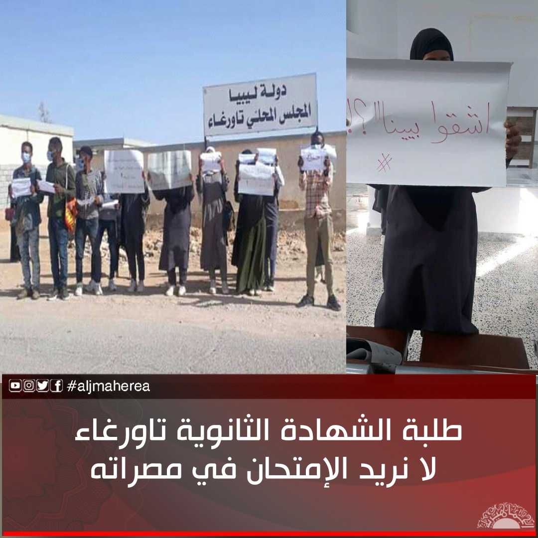 من أمام مقر المؤقت للمجلس المحلي تاورغاء نظم طلاب تاورغاء المقيمين وقفة احتجاجية مطالبين وزارة التعليم بحكومة الوفاق بإجراء امتحانات الشهادة الثانوية في تاورغاء بعد أن تقرر إجرائها في مصراته