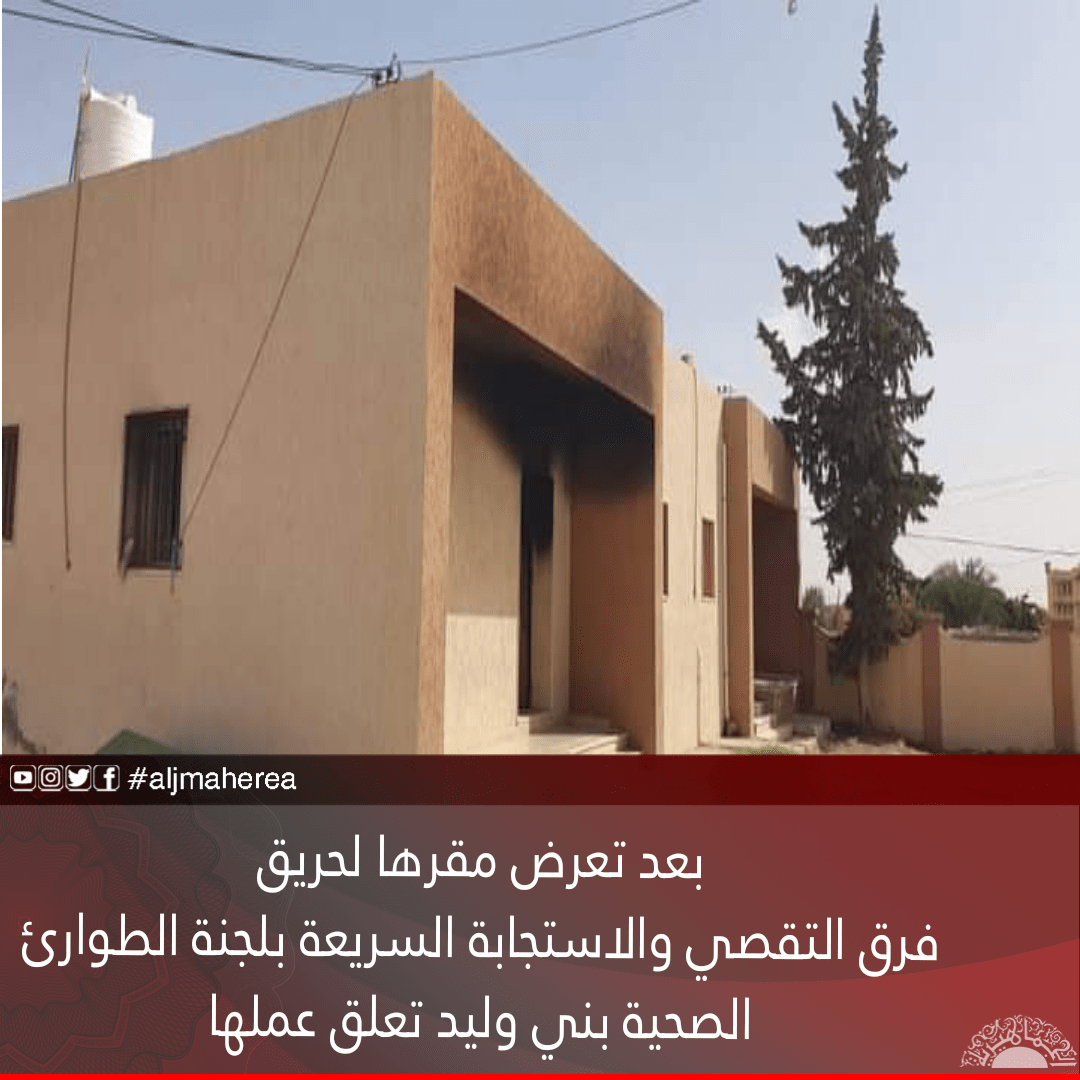 تعرض فجر الجمعة مقر فرق التقصي والاستجابة السريعة بلجنة الطوارئ الصحية بني وليد لحريق اتى على المكان ومحتوياته.