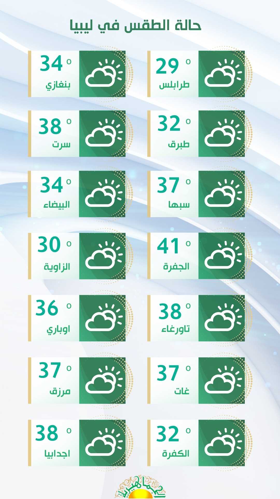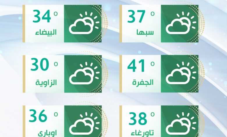 وأشارت النشرة الجوية الصادرة عن المركز إلى أن الحرارة تبقى مرتفعة على باقي مناطق ليبيا، إذ تتراوح بين 35 و41 درجة مئوية، نتيجة الرياح الجنوبية المؤثرة على هذه المناطق، التي تنشط مما قد يتسبب في إثارة للأتربة والغبار أحيانا.