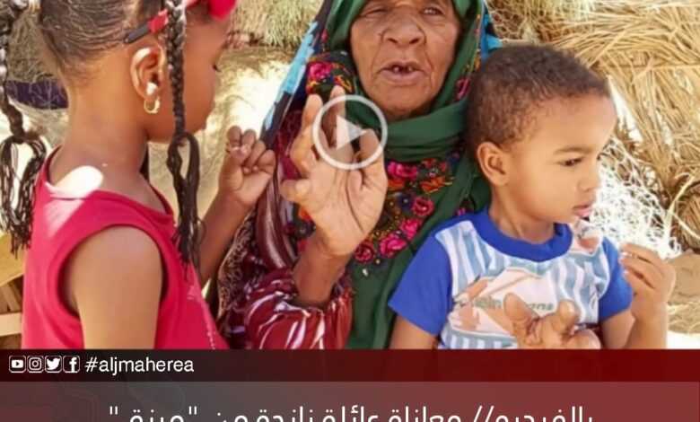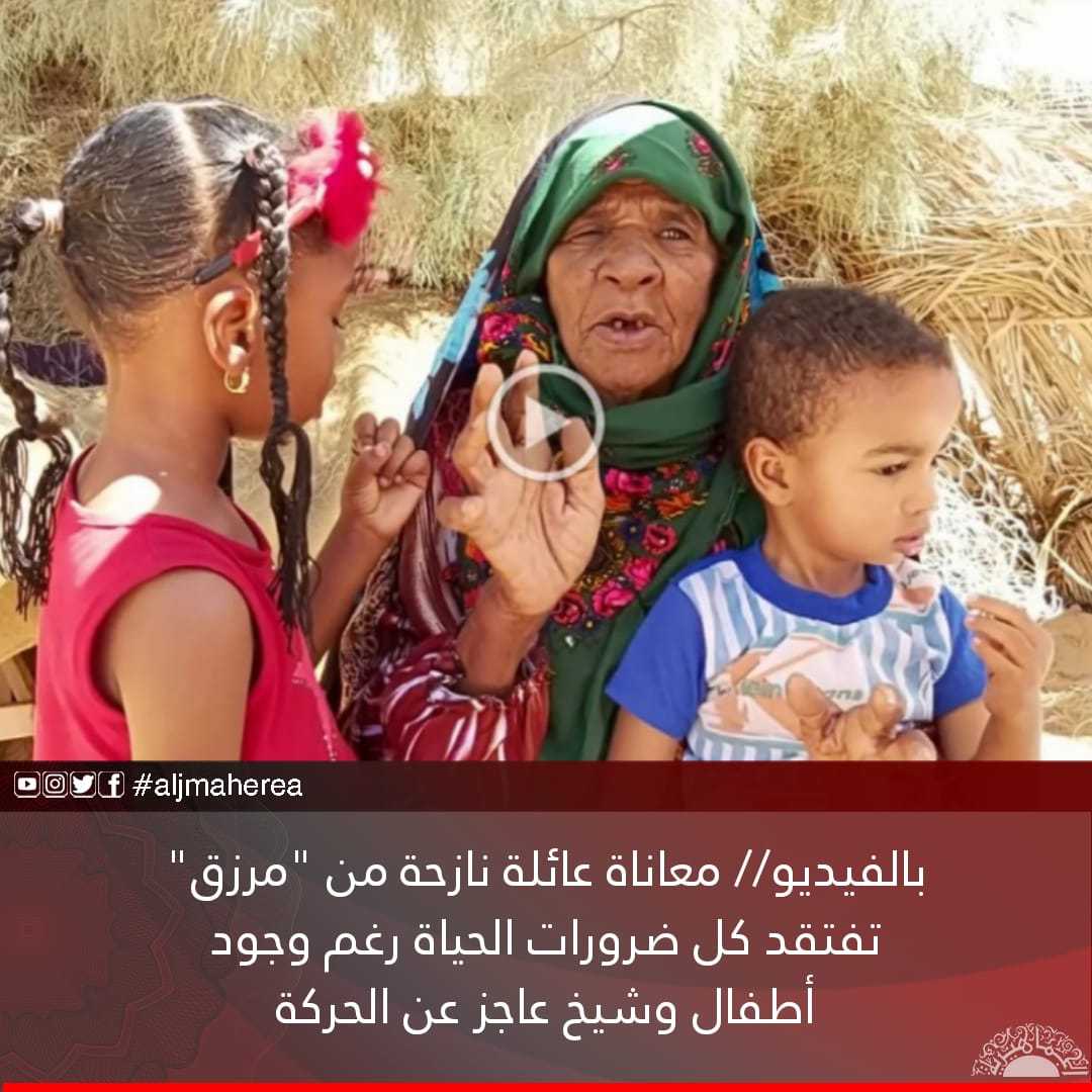 وطالب أحد جيرانهم عبر الفيديو، أهل الخير بمساعدة عائلة العجوز عبد الرحمن المهدي وأسرته، والتي نزحت من مرزق دون ان يكون معهم أي شىء، رغم أن معهما أطفال صغار كما يبدو في الفيديو.