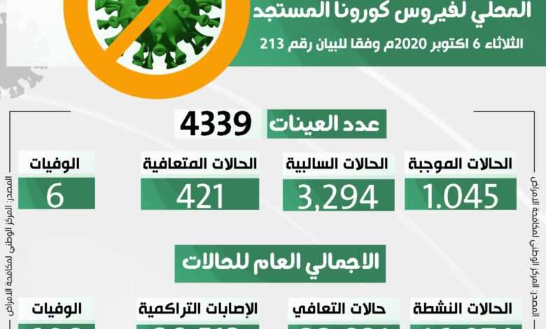 – عدد (1045) عينة موجبة ( 705 جديدة + 340 مخالطة )