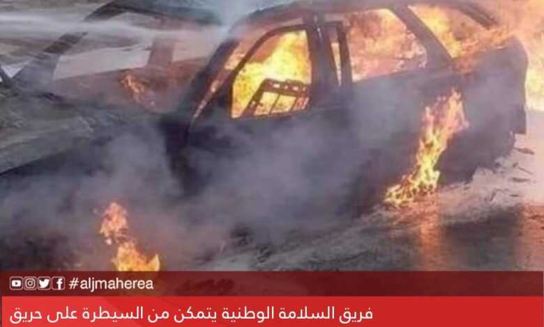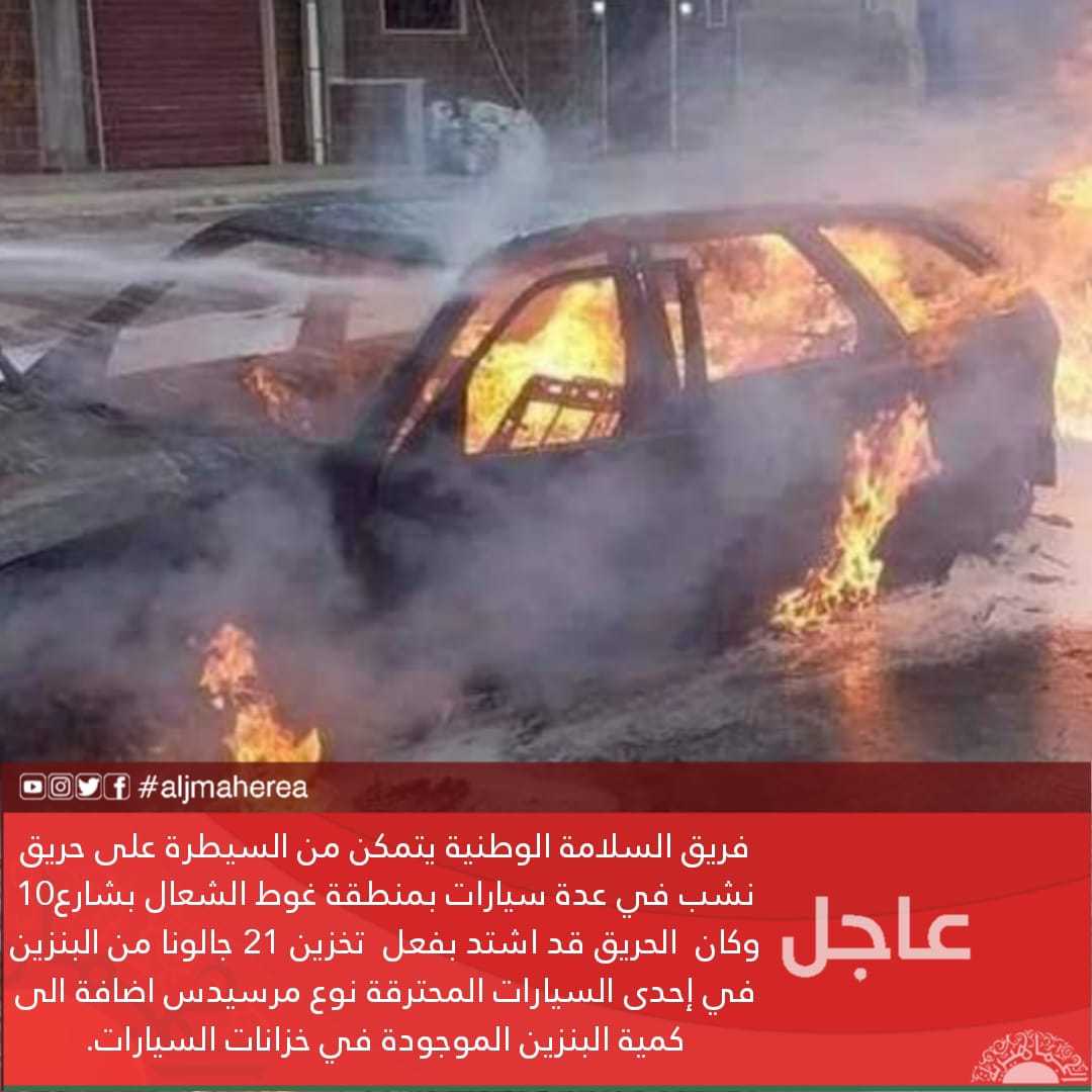 عاجل // فريق السلامة الوطنية يتمكن من السيطرة على حريق نشب في عدة سيارات بمنطقة غوط الشعال بشارع10 وكان الحريق قد اشتد بفعل تخزين 21 جالونا من البنزين في إحدى السيارات المحترقة نوع مرسيدس اضافة الى كمية البنزين الموجودة في خزانات السيارات