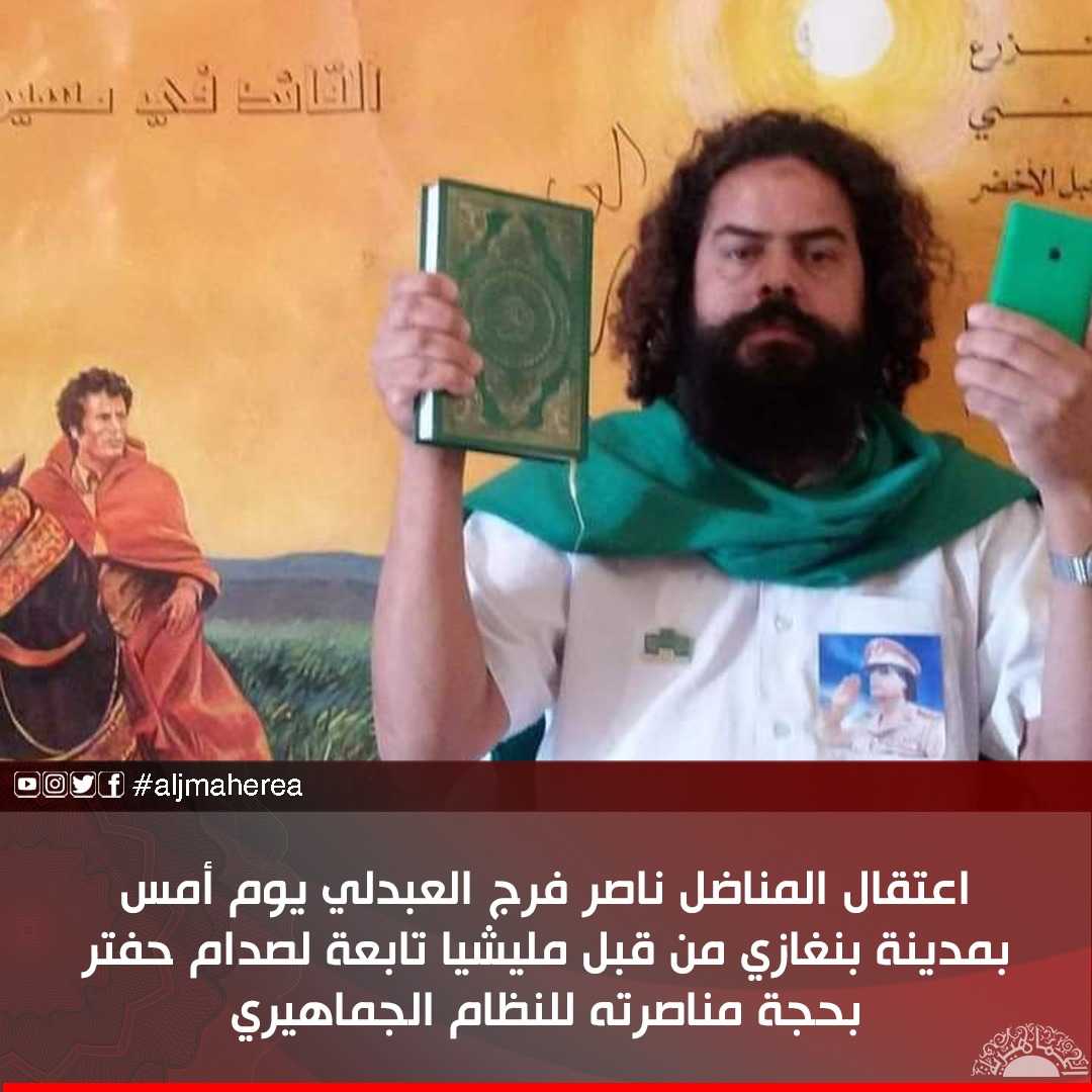 اعتقال المناضل ناصر فرج العبدلي يوم أمس بمدينة بنغازي من قبل مليشيا تابعة لصدام حفتر بحجة مناصرته للنظام الجماهيري