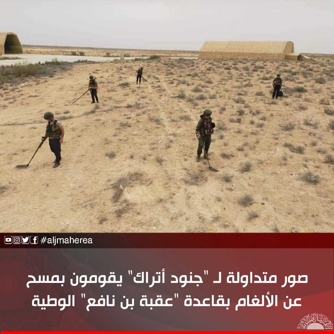 أظهرت صور متداولة، على مواقع التواصل الاجتماعي، جنود جنود أتراك، يقومون بمسح عن الألغام لأغراض غير معروفة بعد سيطرتهم على قاعدة عقبة بن نافع ” الوطية” غرب البلاد.