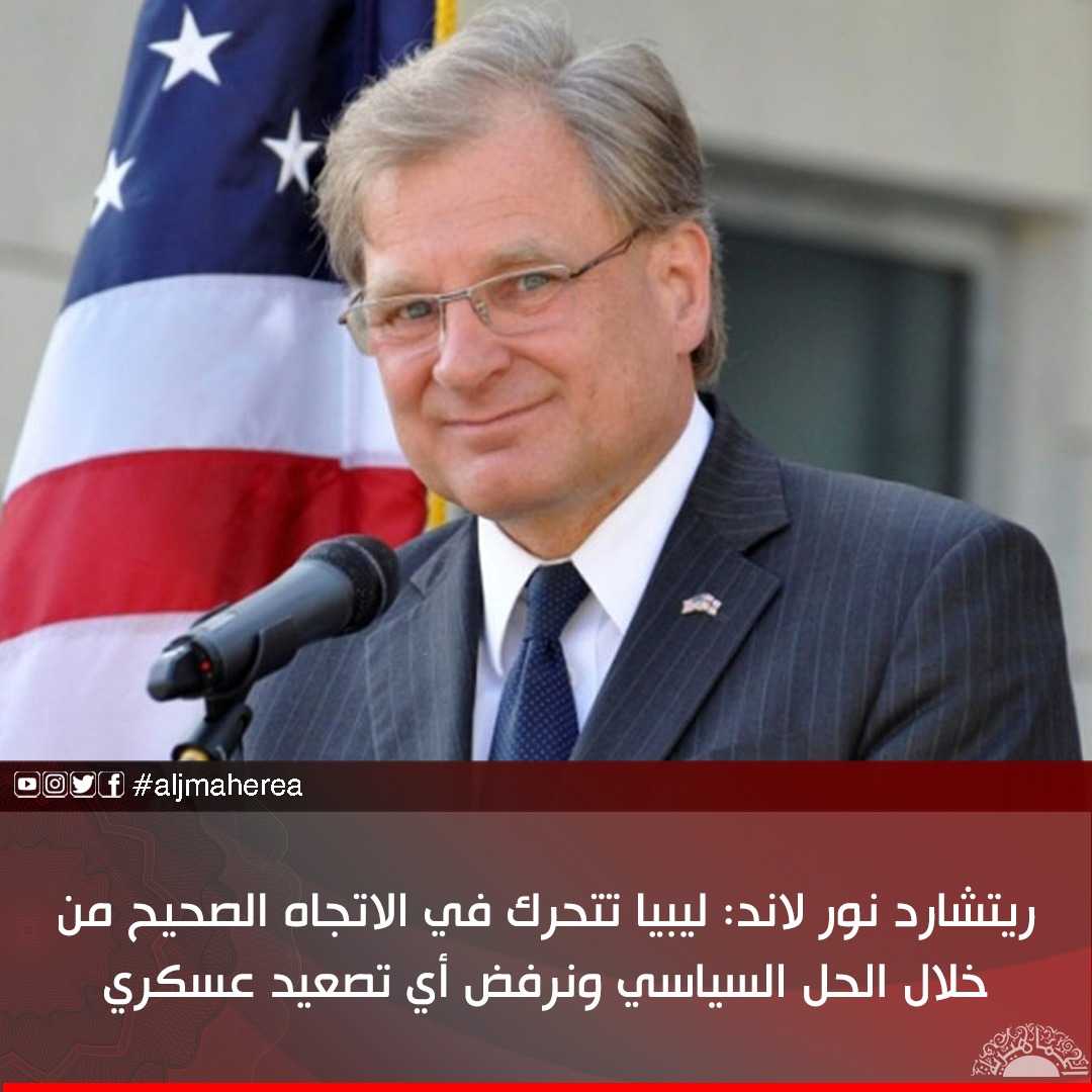 قال السفير الأمريكي، ريتشارد نور لاند، إن ليبيا تتحرك في الاتجاه الصحيح من خلال الحوار السياسي، مشجعا الليبيين على رفض النزاع المسلح، وبناء حوار سياسي وإظهار الشجاعة السياسية على حد قوله.