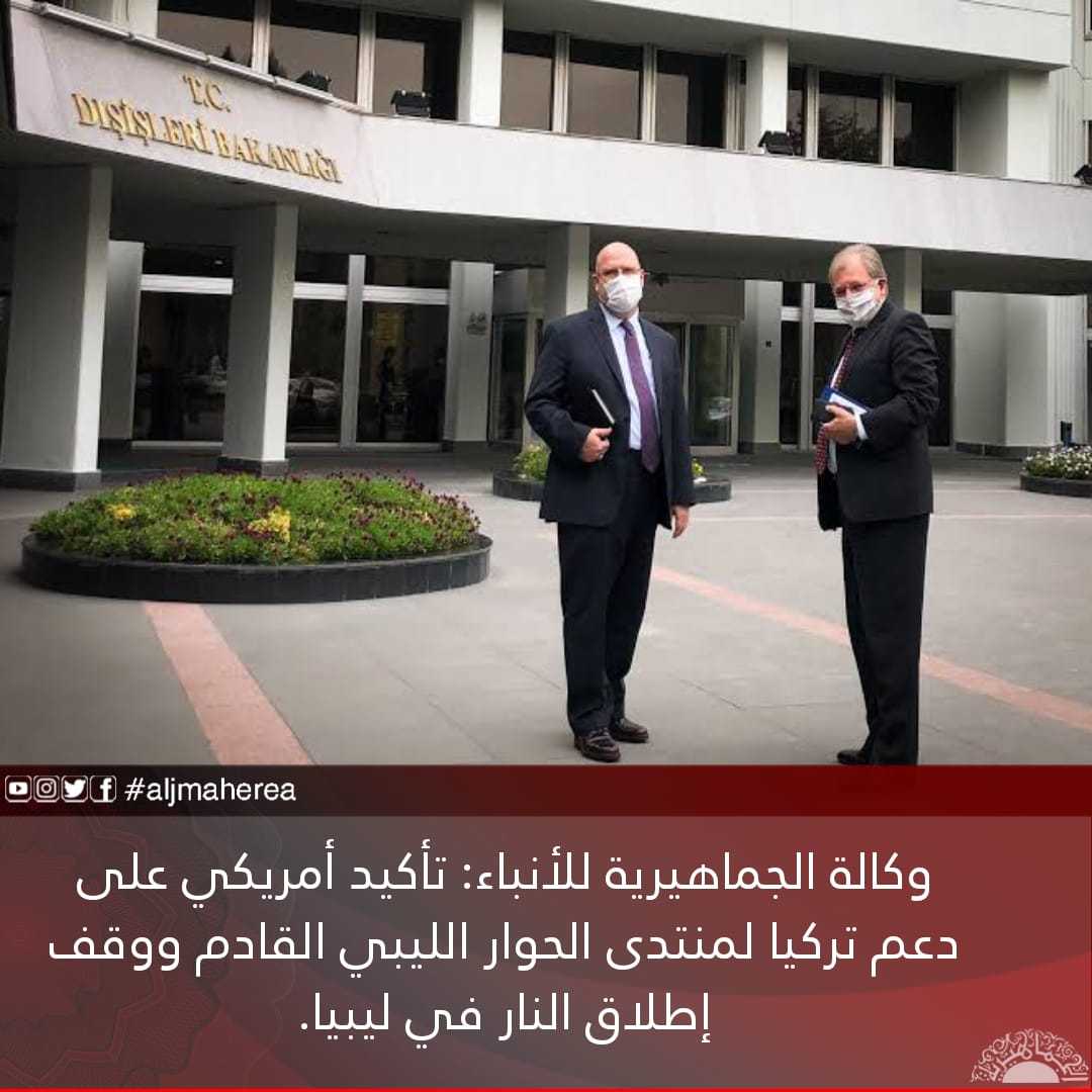وكالة الجماهيرية للأنباء: تأكيد أمريكي على دعم تركيا لمنتدى الحوار الليبي القادم ووقف إطلاق النار في ليبيا.