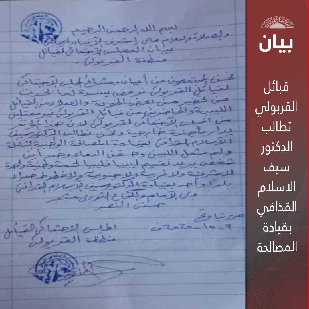 طالب المجلس الاجتماعي لقبائل القربولي الدكتور سيف الإسلام القذافي بقيادة المصالحة الوطنية الشاملة.