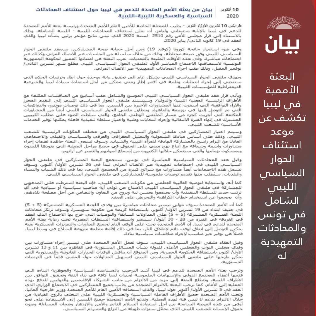 ولفتت ويليامز في بيانها، أنه قبل عقد المحادثات السياسية المباشرة في تونس، ستجمع البعثة المشاركين في ملتقى الحوار السياسي الليبي في اجتماعات تمهيدية عبر الاتصال المرئي تبدأ في 26 تشرين الأول/ أكتوبر. وسوف تشمل هذه الاجتماعات أيضاً مشاورات مع شرائح كبيرة من المجتمع الليبي، بما في ذلك الشباب والنساء والبلديات، سيُطلب منها تقديم توصيات ملموسة للمشاركين في ملتقى الحوار السياسي الليبي. كما أنه، واستجابة لتوصية الغالبية العظمى من مكونات الشعب الليبي، فإن البعثة اشترطت على المدعوين للمشاركة في ملتقى الحوار السياسي الليبي، الامتناع عن تولي أية مناصب سياسية أو سيادية في أي ترتيب جديد للسلطة التنفيذية وأن يجتمعوا بحسن نية وبروح من التعاون والتضامن من أجل مصلحة بلادهم، وأن يحجموا عن استخدام خطاب الكراهية والتحريض على العنف.