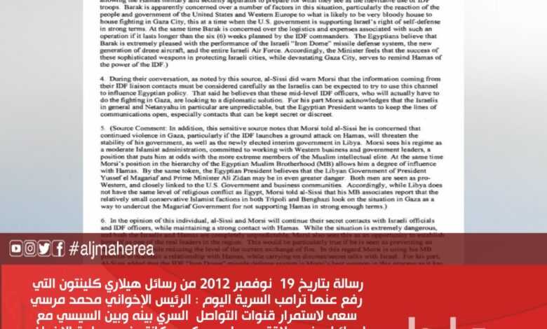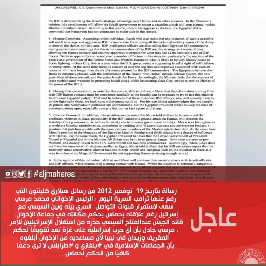 عاجل // رسالة بتاريخ 19 نوفمبر 2012 من رسائل هيلاري كلينتون التي رفع عنها ترامب السرية اليوم : الرئيس الإخواني محمد مرسي سعى لاستمرار قنوات التواصل السري بينه وبين السيسي مع إسرائيل رغم علاقته بحماس بحكم مكانته في جماعة الإخوان. قائد الجيش عبدالفتاح السيسي حذره من استغلال الإسرائيليين للأمر ، مرسي جادل بأن أي حرب إسرائيلية على غزة تعد تقويضًا لحكم المقريف وزيدان في ليبيا لأن مساعديه من الإخوان أبلغوه بأن الجماعات الإسلامية في بنغازي و طرابلس لا ترى دعمًا كافيًا من الحكم لحماس